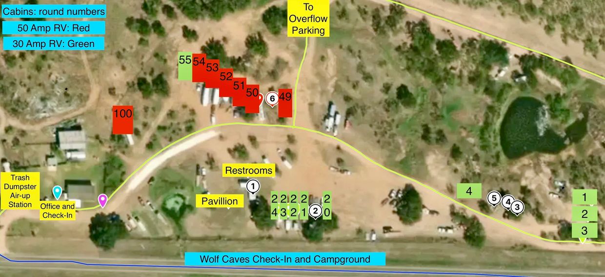 Click below on your choice of a Cabin, or a 30 or 50 Amp RV Campsite, or a 15 Amp tent plug.